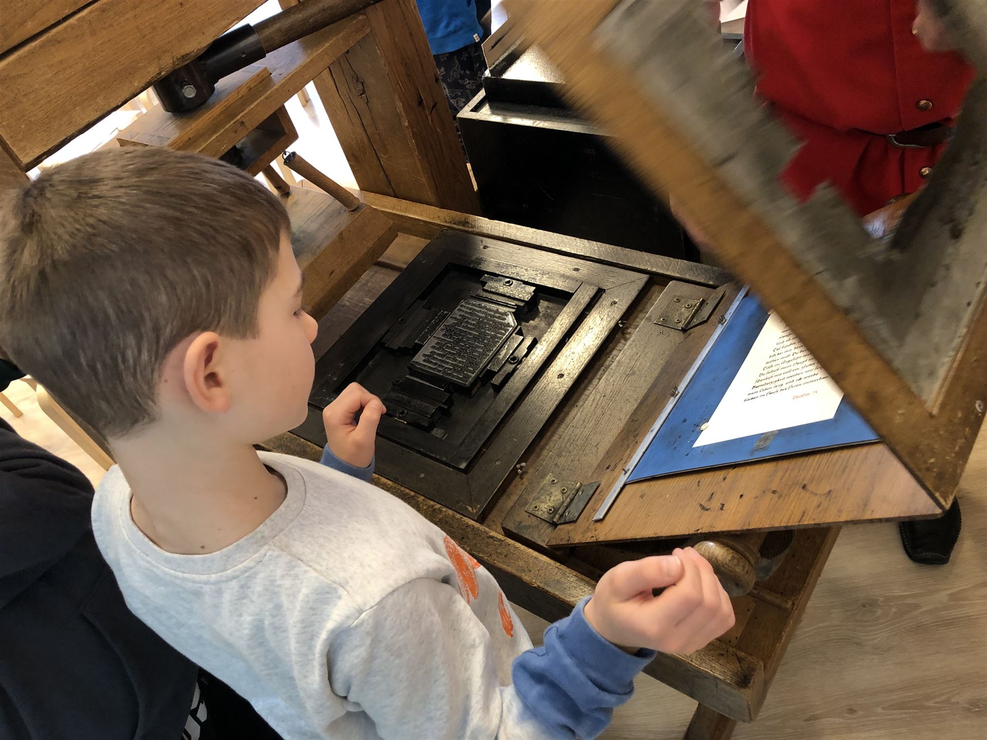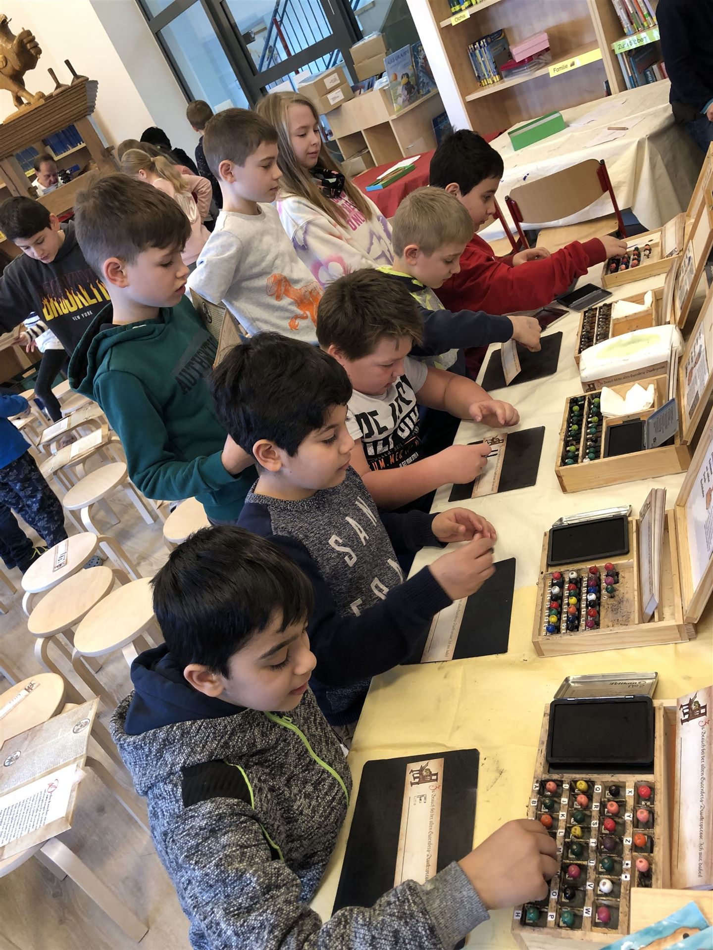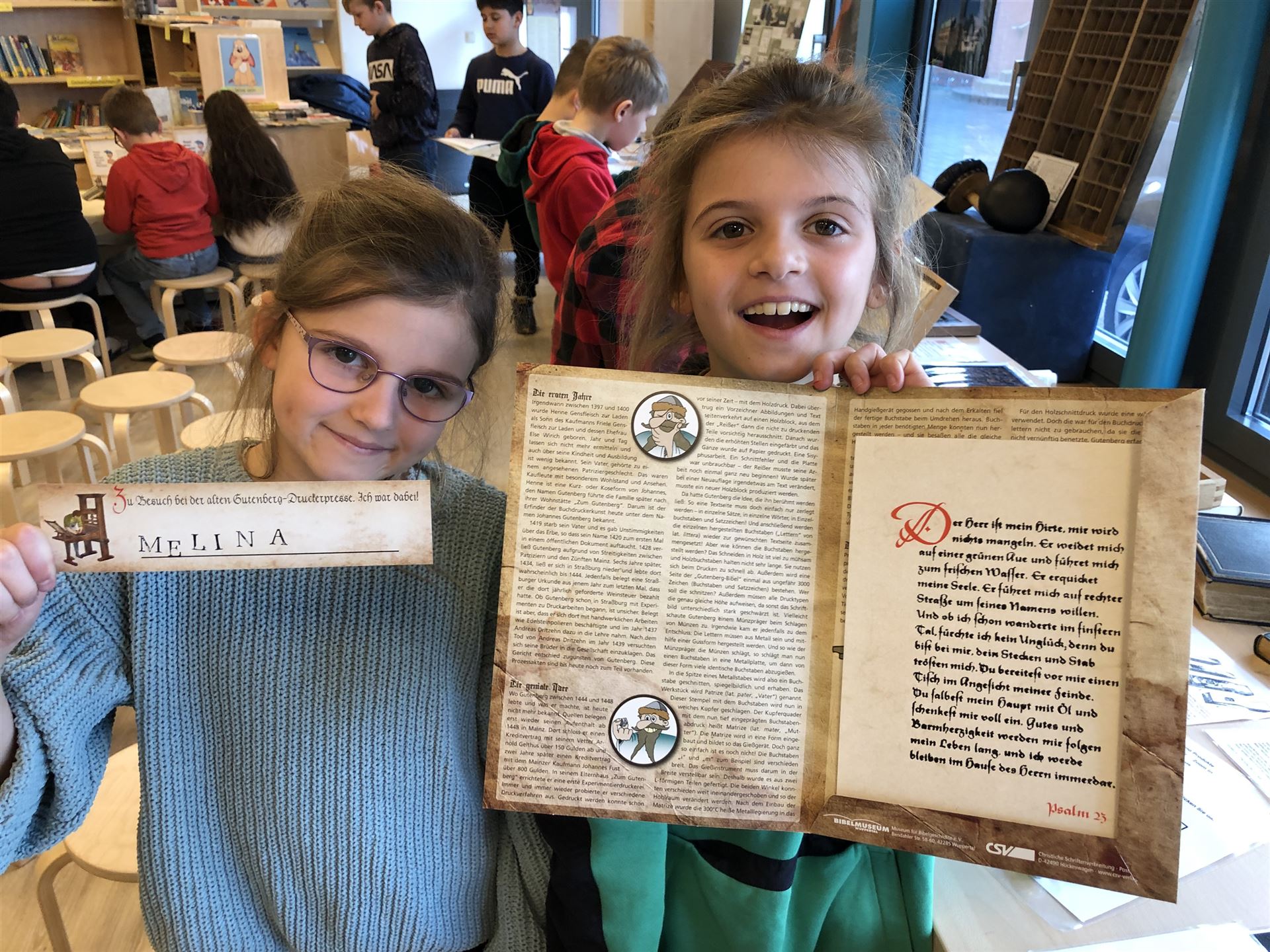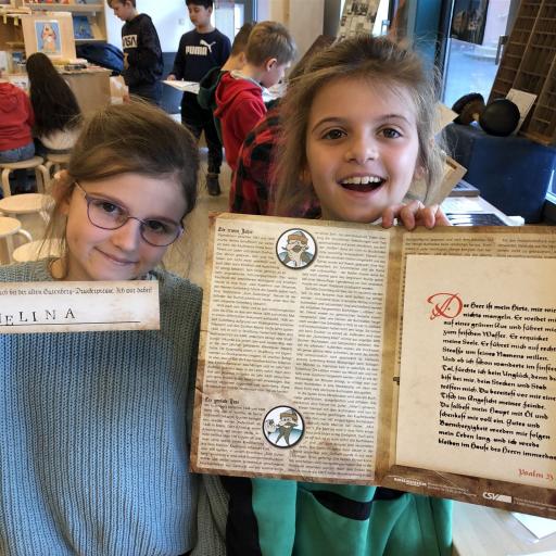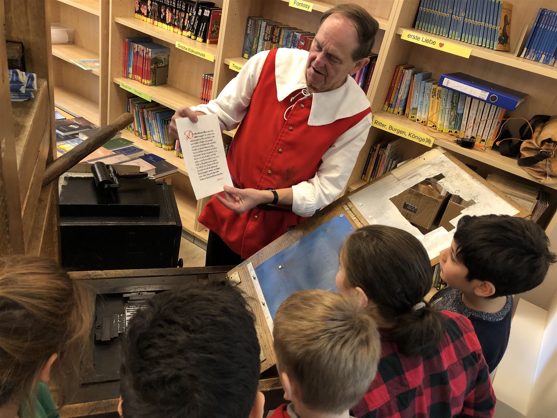 Am 29. Februar 2024 konnten die 3. und 4. Klassen viel über die Entwicklung der Druckkunst lernen. Das Ehepaar Schlawer war nun schon zum dritten Mal zu Gast bei uns und sie brachten außer dem Nachbau der Gutenberg-Buchpresse viele weitere interessante Exponate mit. Darunter waren Bibeln in verschiedenen Größen, Druckplatten und Lettern und alles durften die Kinder ansehen und ausprobieren. Jedes Kind durfte mit der Buchpresse eine Seite drucken und mitnehmen.