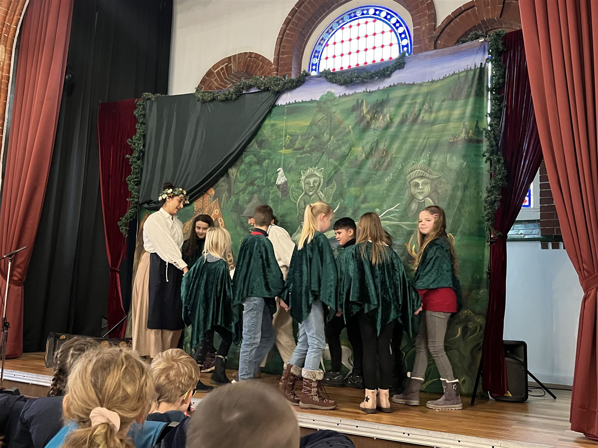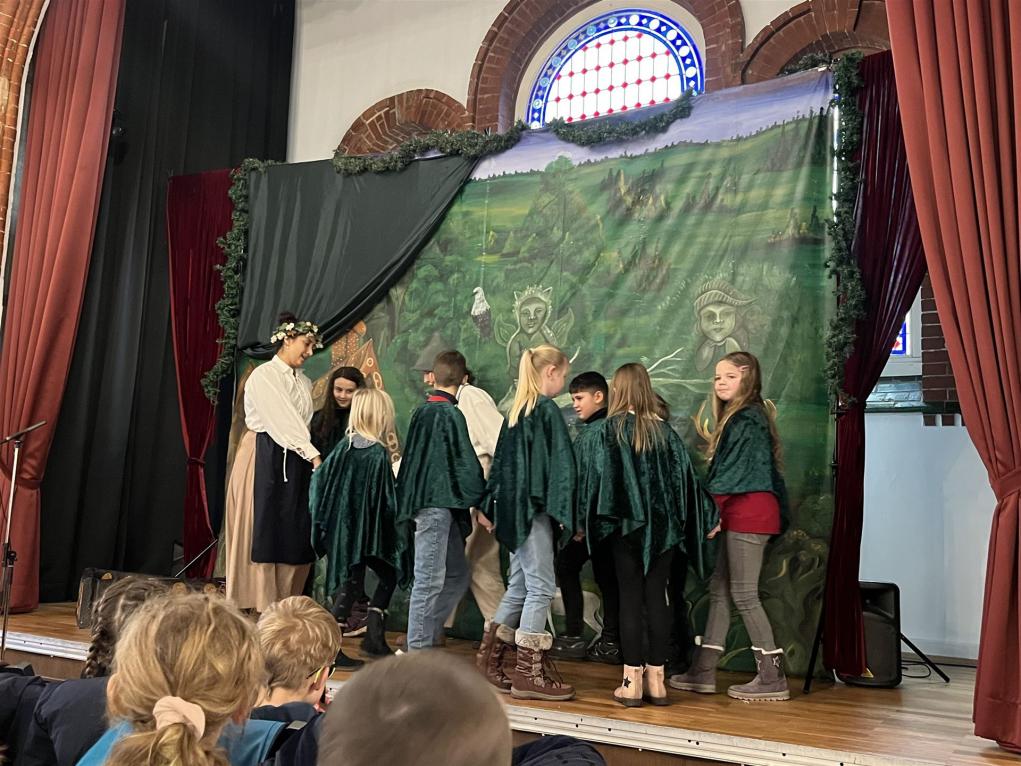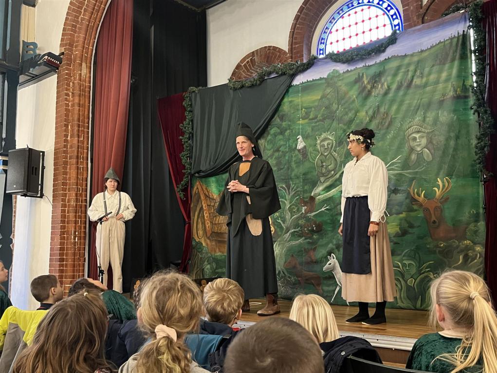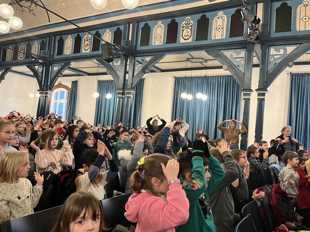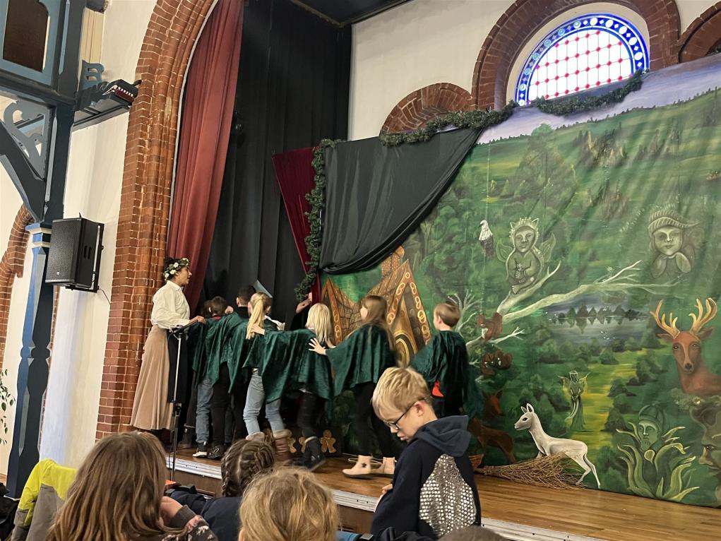 Am 21. Dezember 2023 waren wir mit der ganzen Schule im Bürgersaal des Rathskellers, um eine kindgerechte Aufführung der Oper "Hänsel und Gretel" von Engelbert Humperdinck zu sehen. Im Vorfeld hatten sich alle Klassen im Musikunterricht mit dieser Oper beschäftigt. Einige Kinder konnten sogar als Sandmännchen (Liske Witte), Taumännchen (Joshua Luther) oder Waldengel mitspielen. Die Rolle der Mutter übernahm spontan unsere Lehrerin Frau Schrot. Aber auch alle andern Kinder waren gefordert, denn an drei Stellen durften alle mitsingen. Am Ende bekamen die Mitwirkenden reichlich Applaus, auch das Ehepaar Janssen, das uns den Bürgersaal zur Verfügung gestellt hat. Vielen Dank dafür!
