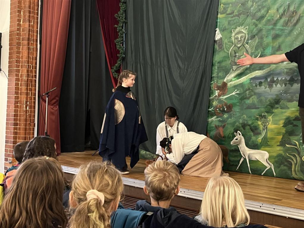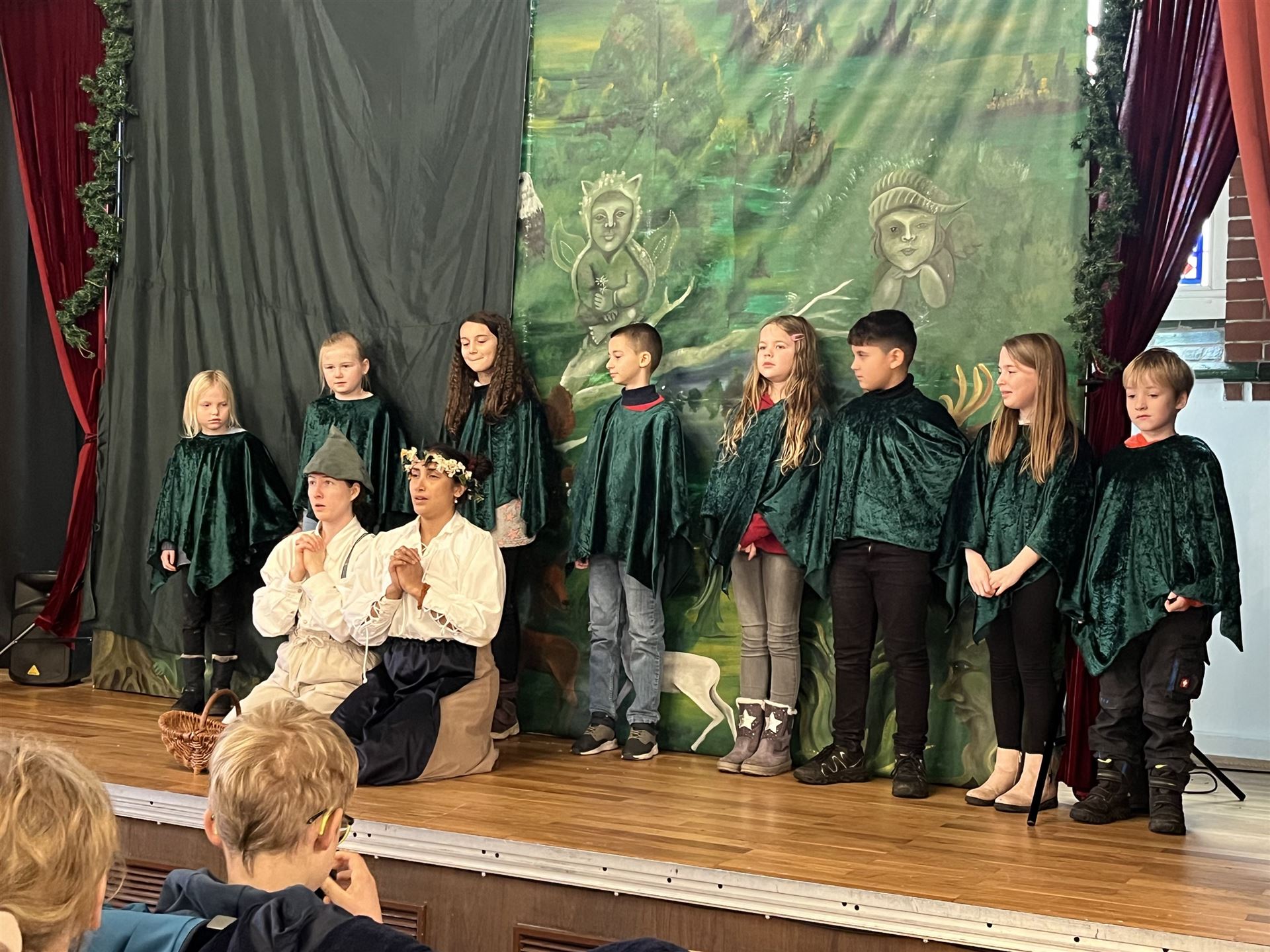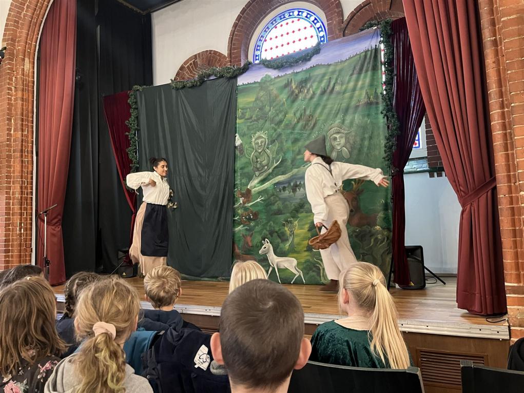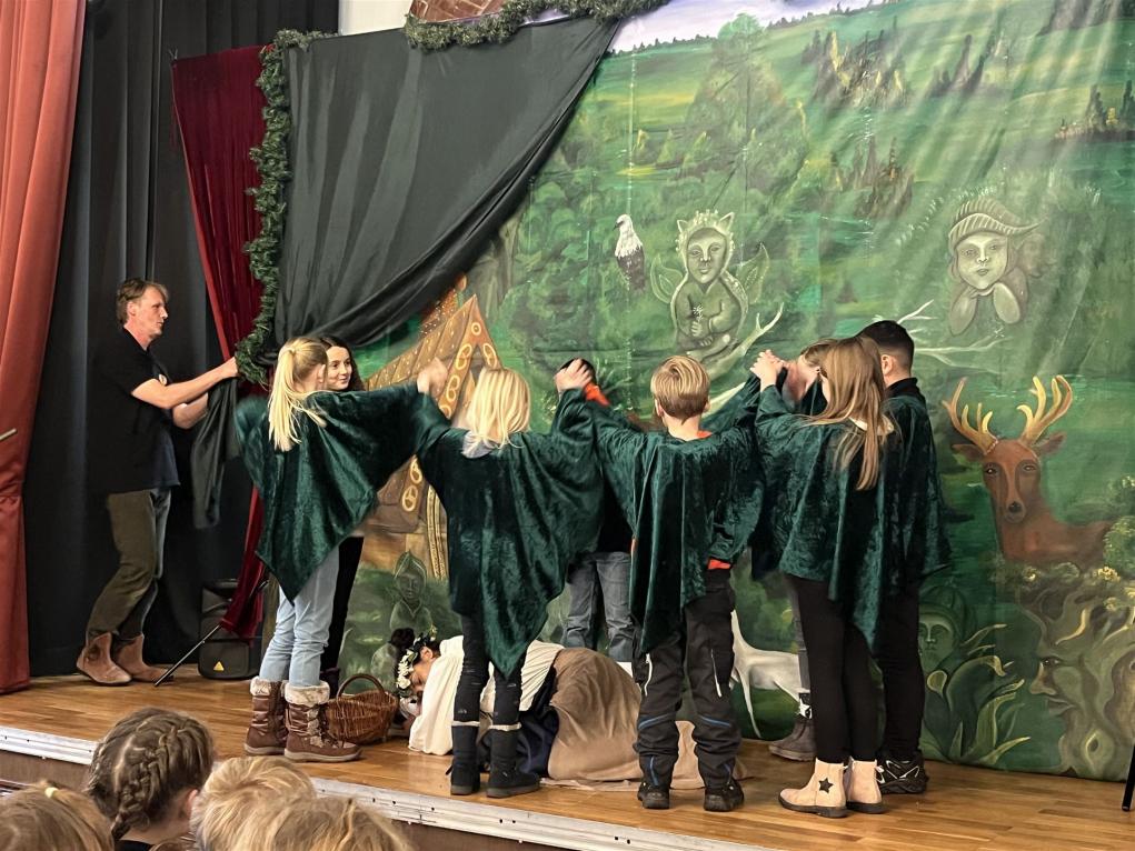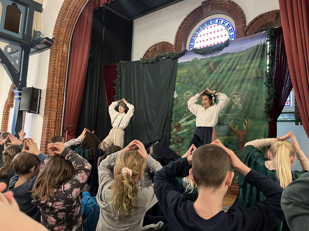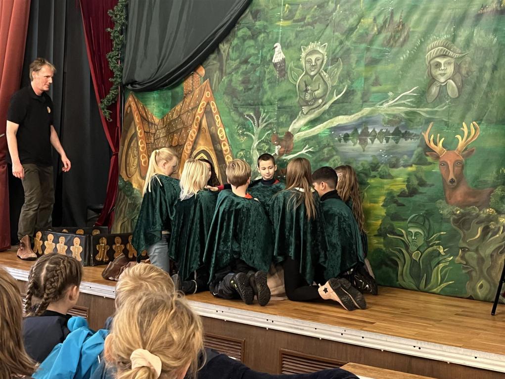 Am 21. Dezember 2023 waren wir mit der ganzen Schule im Bürgersaal des Rathskellers, um eine kindgerechte Aufführung der Oper "Hänsel und Gretel" von Engelbert Humperdinck zu sehen. Im Vorfeld hatten sich alle Klassen im Musikunterricht mit dieser Oper beschäftigt. Einige Kinder konnten sogar als Sandmännchen (Liske Witte), Taumännchen (Joshua Luther) oder Waldengel mitspielen. Die Rolle der Mutter übernahm spontan unsere Lehrerin Frau Schrot. Aber auch alle andern Kinder waren gefordert, denn an drei Stellen durften alle mitsingen. Am Ende bekamen die Mitwirkenden reichlich Applaus, auch das Ehepaar Janssen, das uns den Bürgersaal zur Verfügung gestellt hat. Vielen Dank dafür!