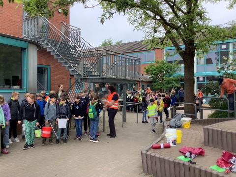 Zum dritten Mal fand am 3. Mai 2024 unser Umwelttag statt. Nachdem der eigentlich geplante Tag völlig verregnet war, war das Wetter eine Woche später zum Glück wesentlich besser, sodass alle Klassen nach einem gemeinsamen Beginn auf dem Schulhof ausschwärmen konnten, um Rehburg ein bisschen sauberer zu machen. Überall wurde fleißig der unbedacht weggeworfene Müll eingesammelt und in großen Säcken zu den vereinbarten Sammelpunkten gebracht. Ein Mitarbeiter des Bauhofs war dann zur Stelle, um alle Müllsäcke einzusammeln und in einen Container zu bringen, den der BAWN (Betrieb Abfallwirtschaft Nienburg) neben Handschuhen, Müllzangen und Müllbeuteln zur Verfügung gestellt hatte. Vielen Dank dafür!