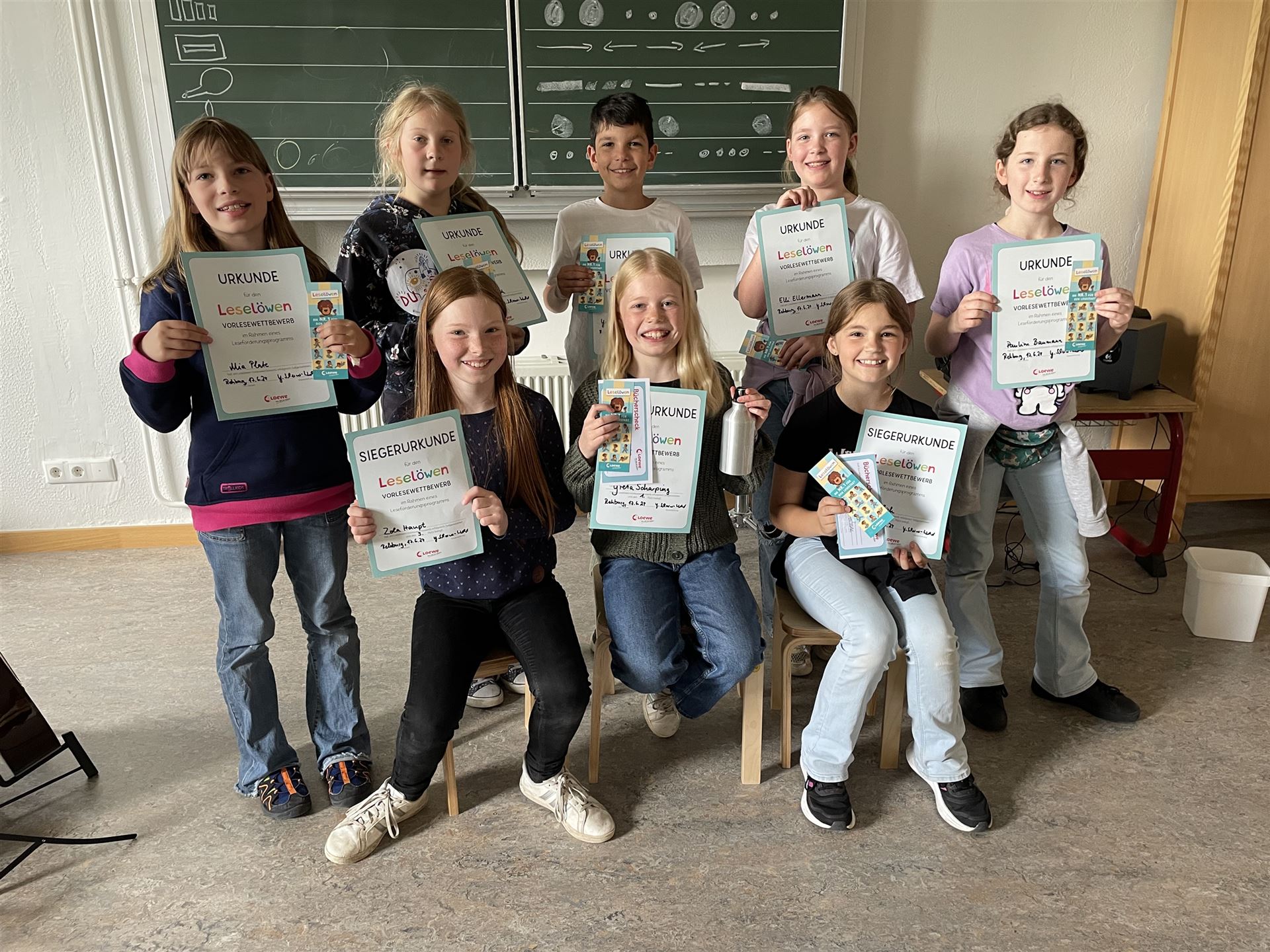 Der diesjährige Vorlesewettbewerb der 4. Klassen fand am 17.Juni statt. Je 4 Kinder aus einer Klasse hatten sich zuvor im klasseninternen Wettbewerb dafür qualifiziert. Genau wie in der Klasse musste nun jedes Kind einen geübten und einen unbekannten Text vorlesen. Die Jury, bestehend aus Lehrkräften, Mitgliedern des Fördervereins und ehrenamtlichen Lesehelfern, vergab nach den Vorträgen Punkte für die Leseflüssigkeit und Betonung. Die Kinder hatten sich alle gut vorbereitet und so lagen die Bewertungen dicht beieinander. In der Pause sorgte der Förderverein für eine Erfrischung der Kinder. Die Siegerurkunden und Büchergutscheine, gestiftet von der Firma Schuhmacher, gingen schließlich an diese drei Erstplatzierten: